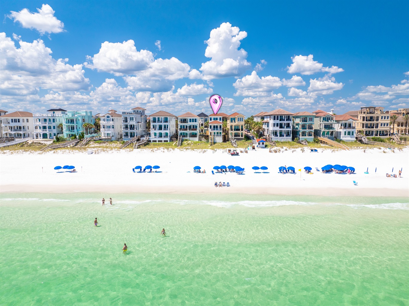 Aerial view of Pink Palace Destin, a beachfront rental, showing private beach access and 4 chairs with 2 umbrellas set up on the sand.