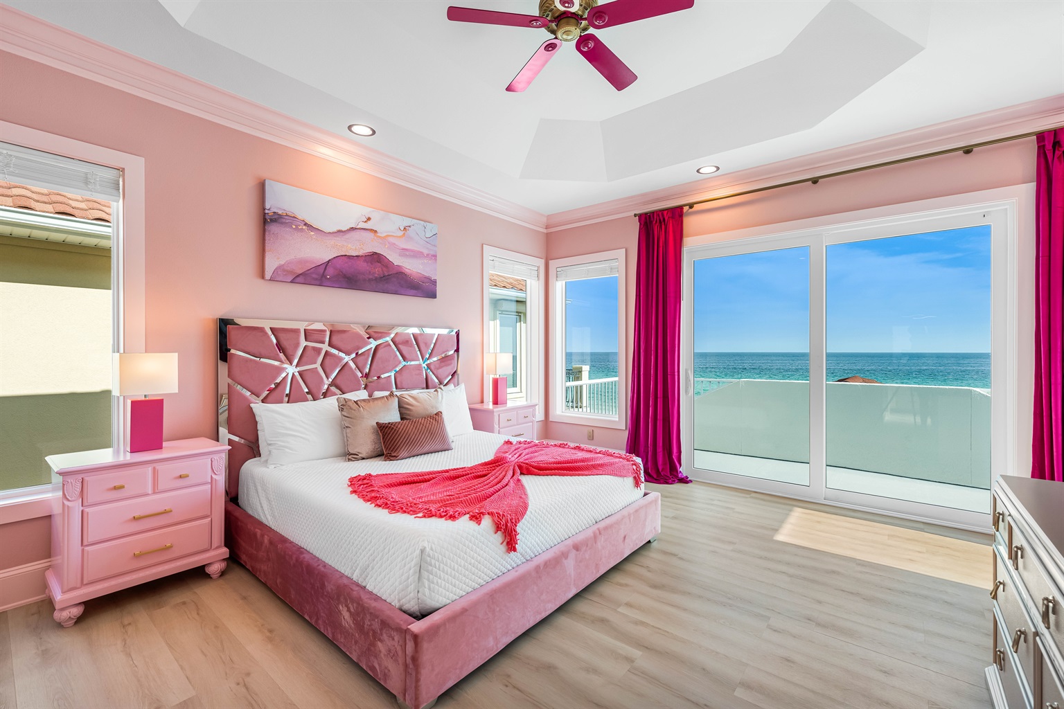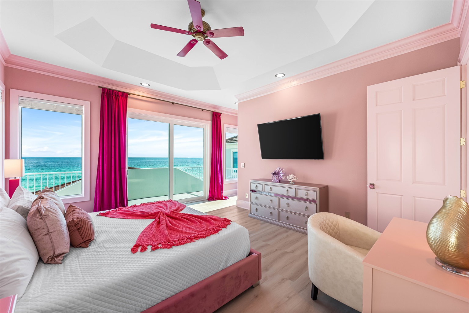 Iconic Pink Aesthetic & Spacious Layout: A uniquely themed, spacious Destin masterpiece designed with grand proportions for effortless group living and high-end entertaining.