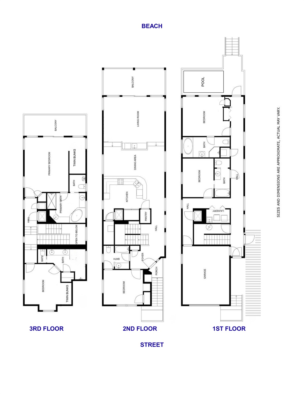Three-story floor plans for the Pink Palace, showcasing five King Suites, zero-step entry, private elevator access, and a beachfront layout in Destin, Florida.